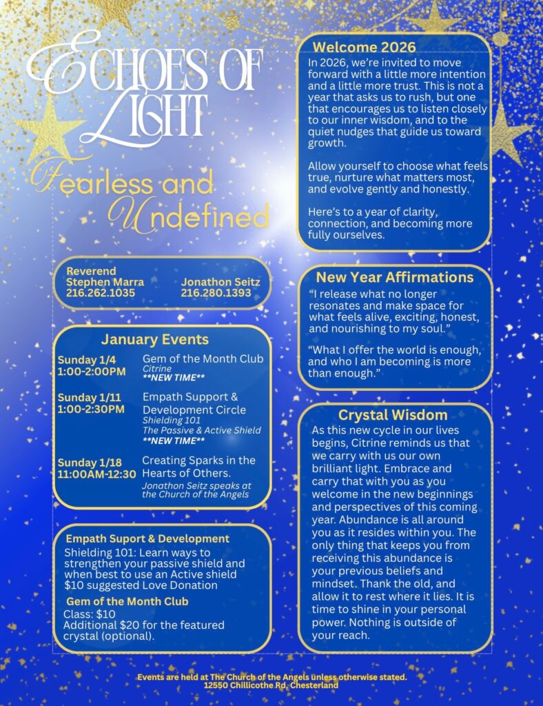 January 2026 HomeNewsletter / January 2026 Screenshot CitrineCrystal wisdomGratitudeMessage Leave a Reply Cancel replyYour email address will not be published. Required fields are marked *Comment * Name * Email * Website Save my name, email, and website in this browser for the next time I comment. Δ